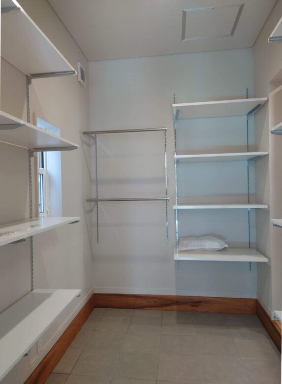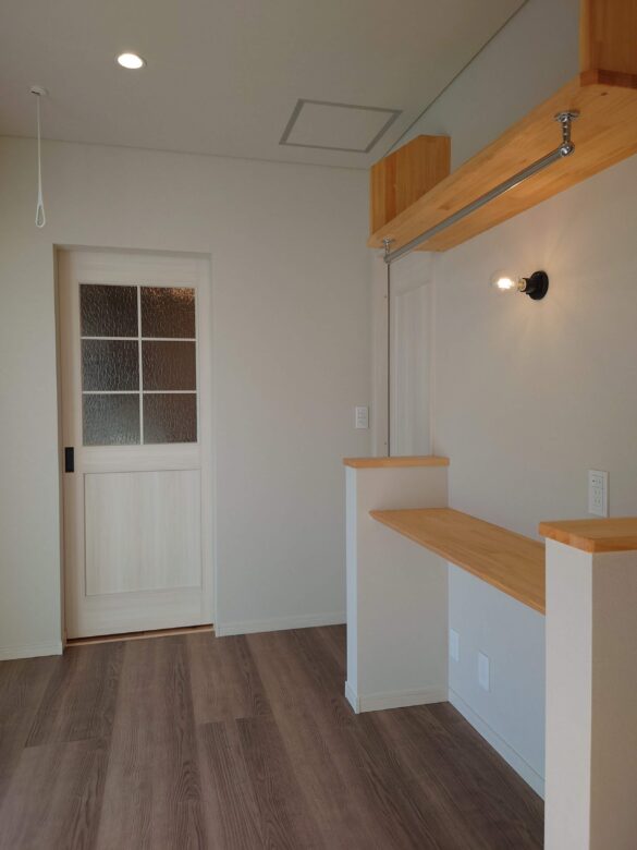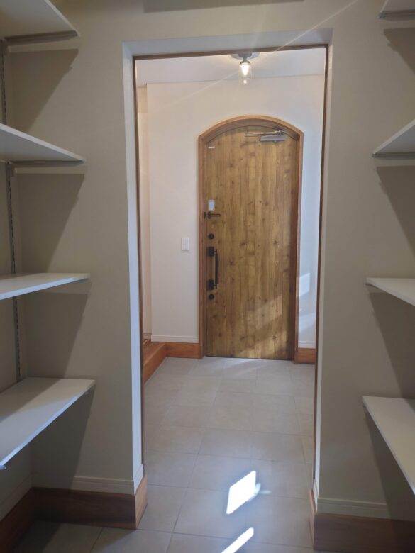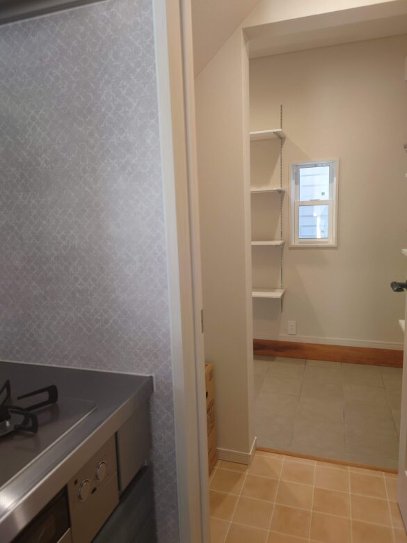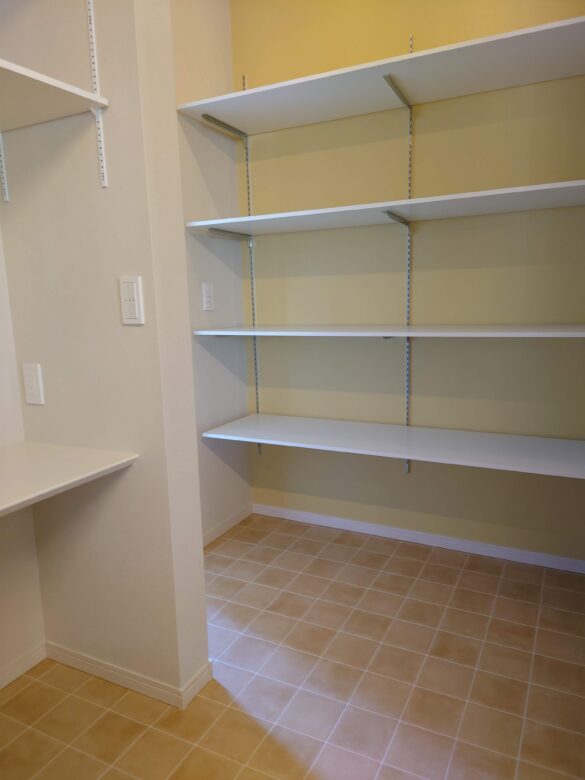 キッチン背面にもさらにパントリーも確保。奥さんのデスクコーナーもあります。奥にある勝手口はゴミ動線として。