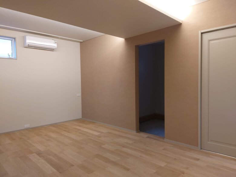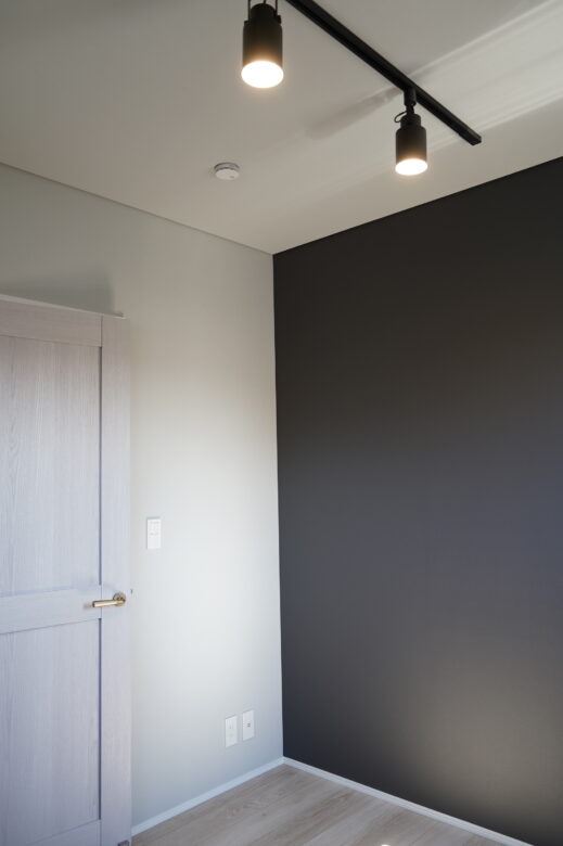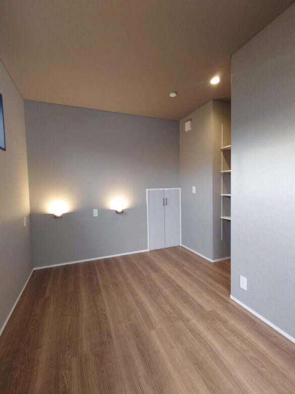 落ち着いたベッドルーム。奥には小屋裏収納も配置しました